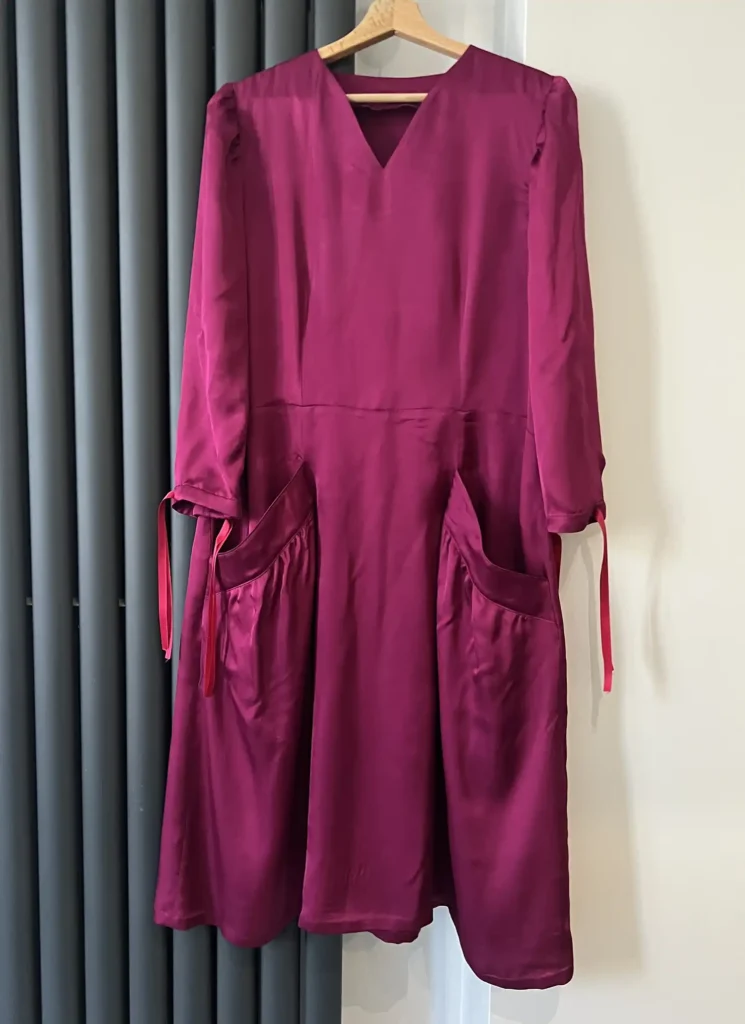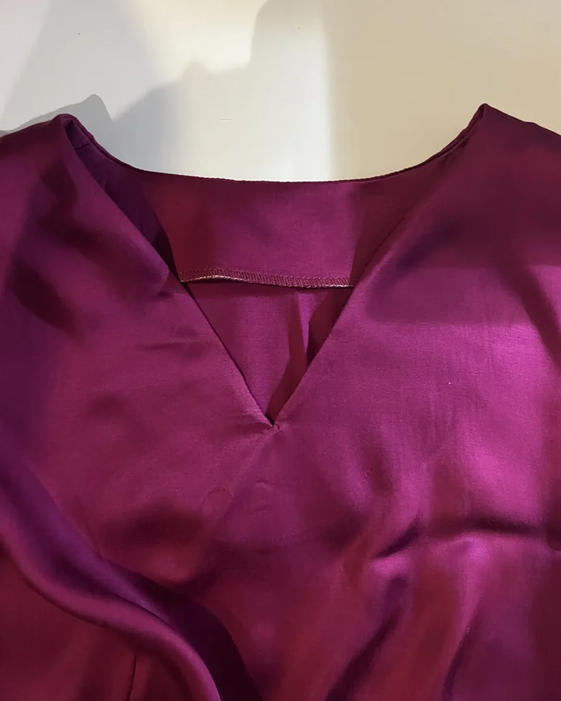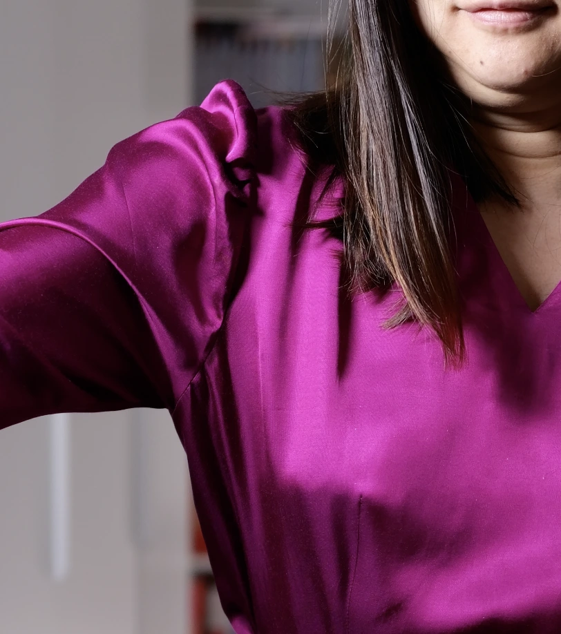J’ajouterais un petit mot concernant le tissu que j’ai utilisé : il s’agit de la viscose Eleanora de Torretto Tessuti vendue dans le kit validé par Artesane. Ce tissu est très joli et a un tombé superbe et une magnifique couleur très profonde. Néanmoins il a un tissage satin ce qui m’a quand même ajouté une difficulté supplémentaire ! Si vous n’avez jamais cousu de viscose, ou si vous êtes débutante, je vous conseille d’aller vers d’autres kits comme ceux d’Atelier de la Création. Si vous voulez vous lancer un défi et vous préparer pour Ismérie, alors foncez !