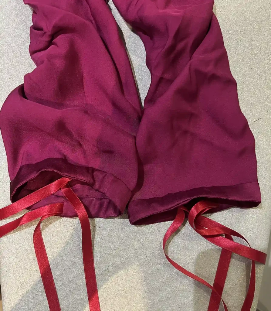 Les bracelets de manche, c’est vraiment la partie la plus déconcertante de la robe ! En effet, le bracelet est patronné d’une manière que vous ne retrouverez jamais : les bracelets sont en 4 parties au lieu de 2, et le ruban est coupé en 2 pièces de longueur différentes au lieu de coulisser d’une traite !