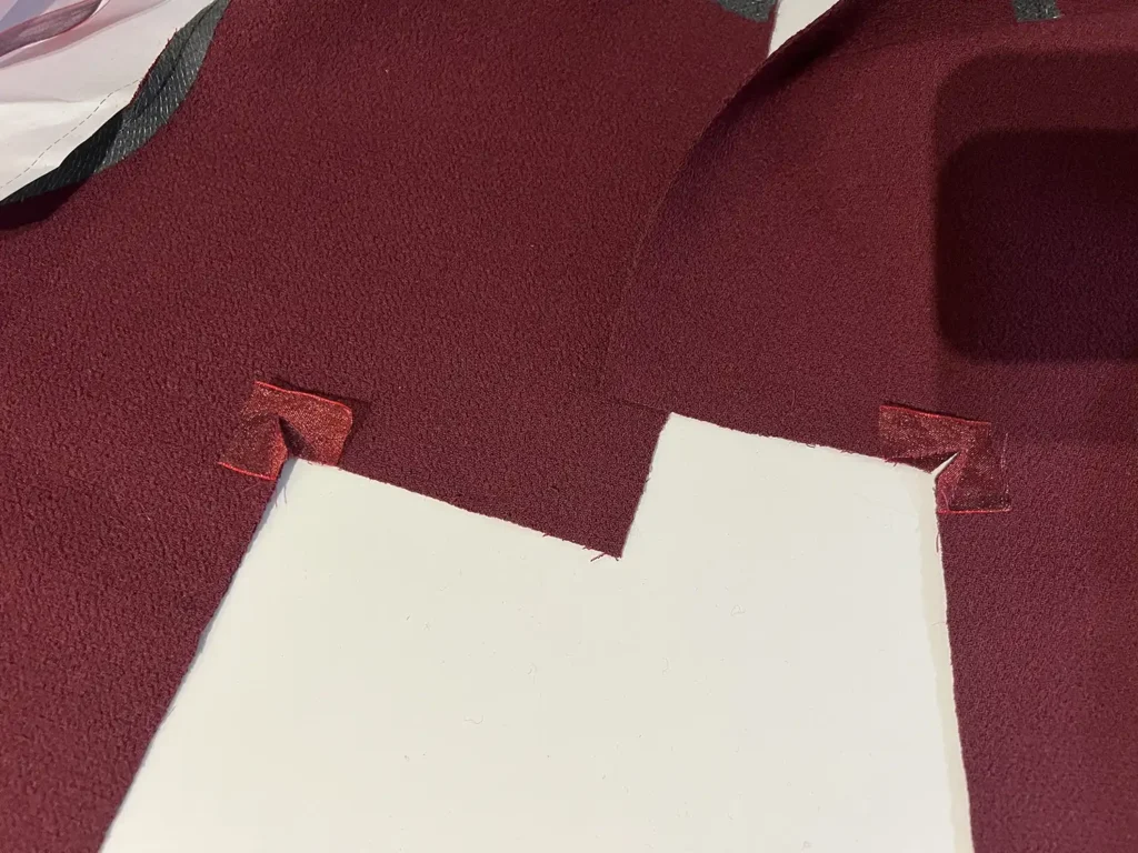 La robe Catalina possède des découpes avec des angles sur le devant et le dos. C’est une couture qui se prépare avec des renforts pour éviter que le tissu ne s’éraille. Vous devrez fendre l’angle avant de piquer les 2 tissus ensemble.