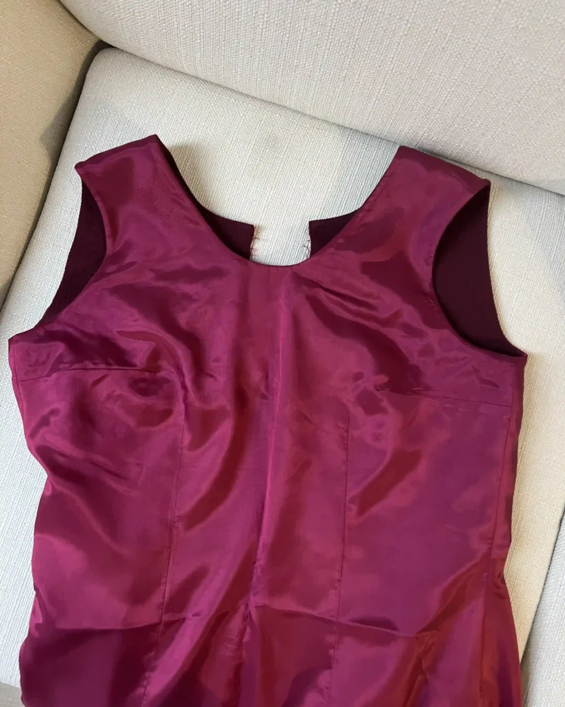 A part cela, pas de grande difficulté puisque vous allez fermer la doublure par un point main, pas besoin de retourné acrobatique pour retrouver la robe sur l’endroit !