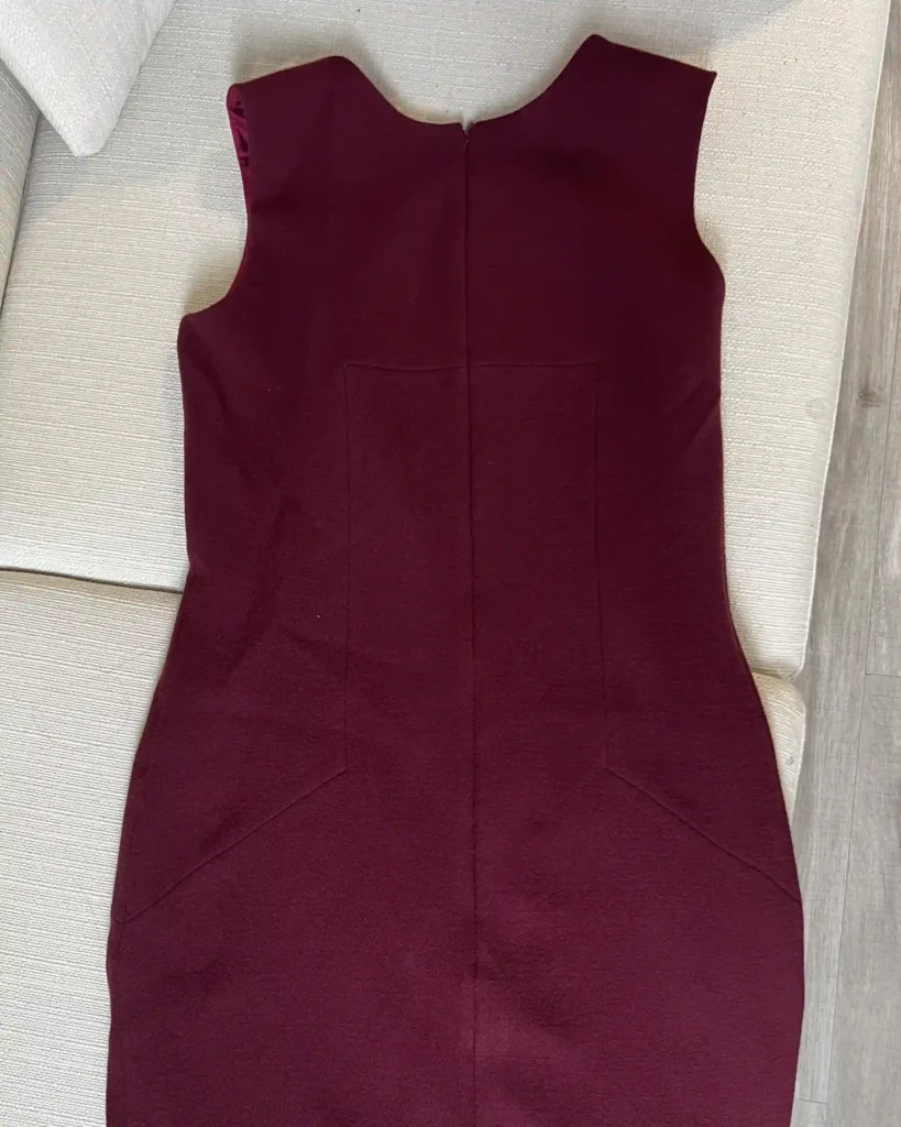 La robe Catalina est une robe cintrée, assez courte, fermée par un zip invisible sur l’arrière. Elle ne possède pas de manches et elle est entièrement doublée.
