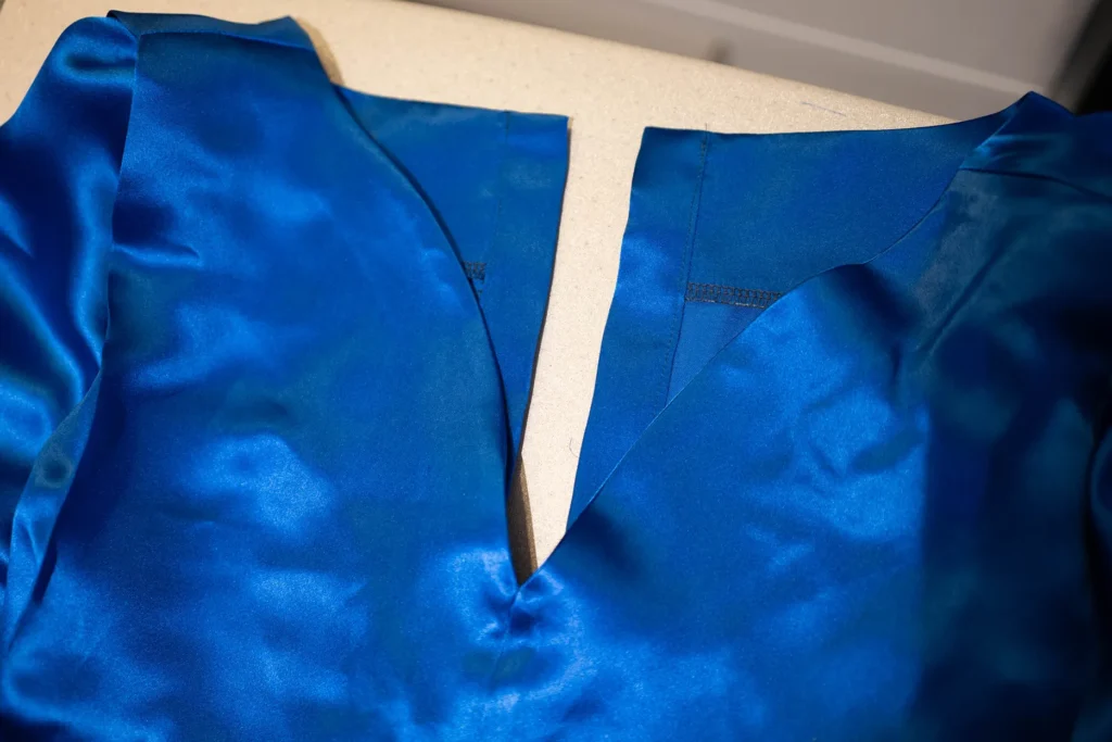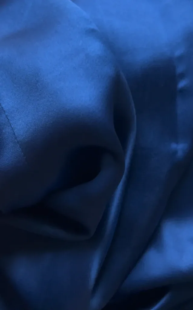 J’ai immédiatement craqué pour la couleur bleu océan profond et les incroyables reflets de ce tissu ! Ce tissu a un magnifique tombé, très fluide, bien plombant ! La composition soie et viscose mélangée rend le tissu plus facile à coudre et moins fragile qu’une pure soie.